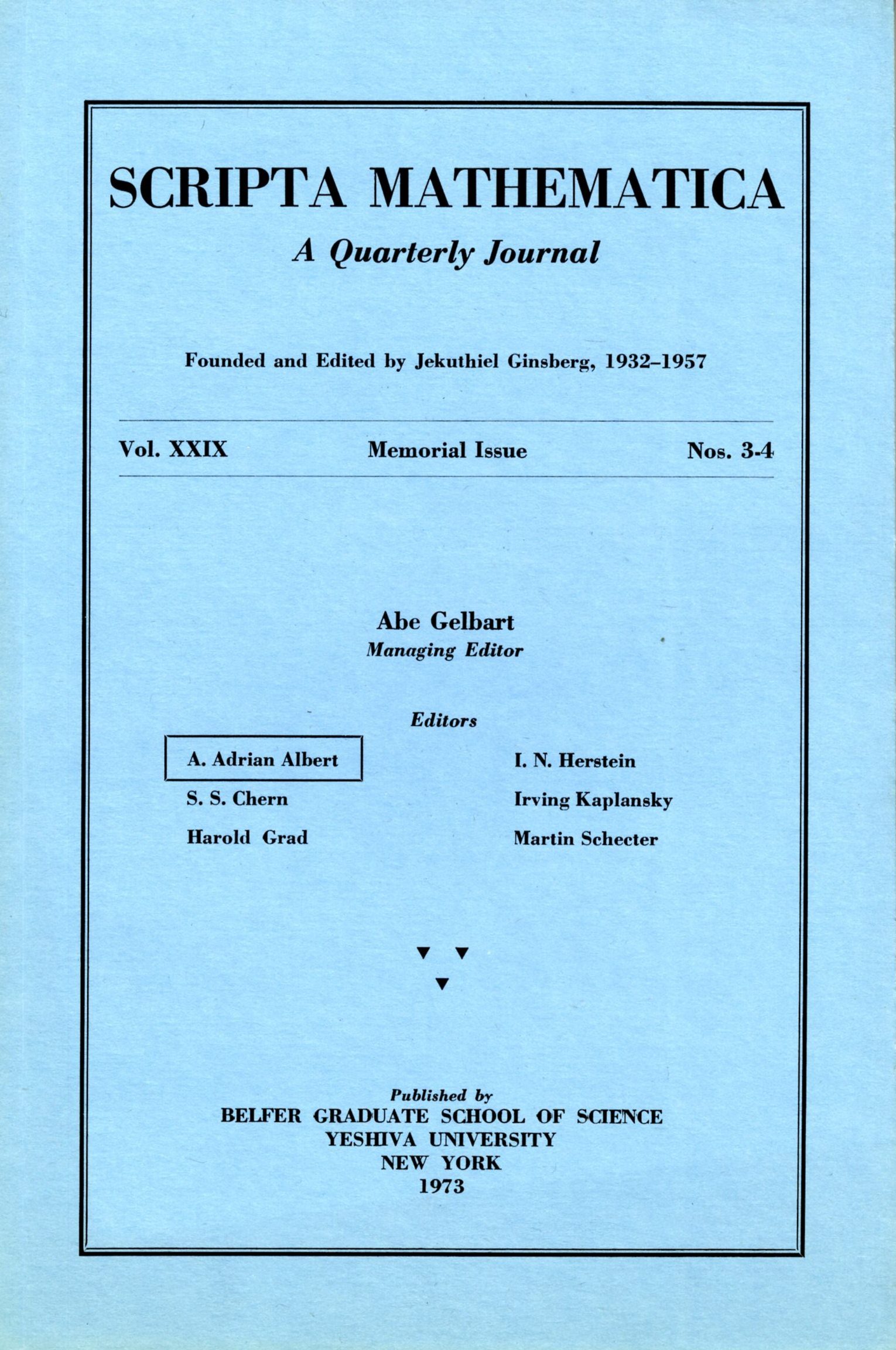 The significance of … Scripta Mathematica, is deepened in these days by the dark cloud of medieval oppression and persecution in a home of Kultur, where books, even in the pure science of mathematics, are being destroyed, as though research, culture, the pursuit of disinterested learning, were the sole prerogative of a single people. It is truly symbolic of American liberalism and the spirit of true scholarship, that the best scientific minds of several lands have united to make possible the issuance and quality of “Scripta Mathematica” published by a college under Jewish auspices. The cooperation of these scholars and friends of learning shows the broadly human nature of true concern for cultural advancement.